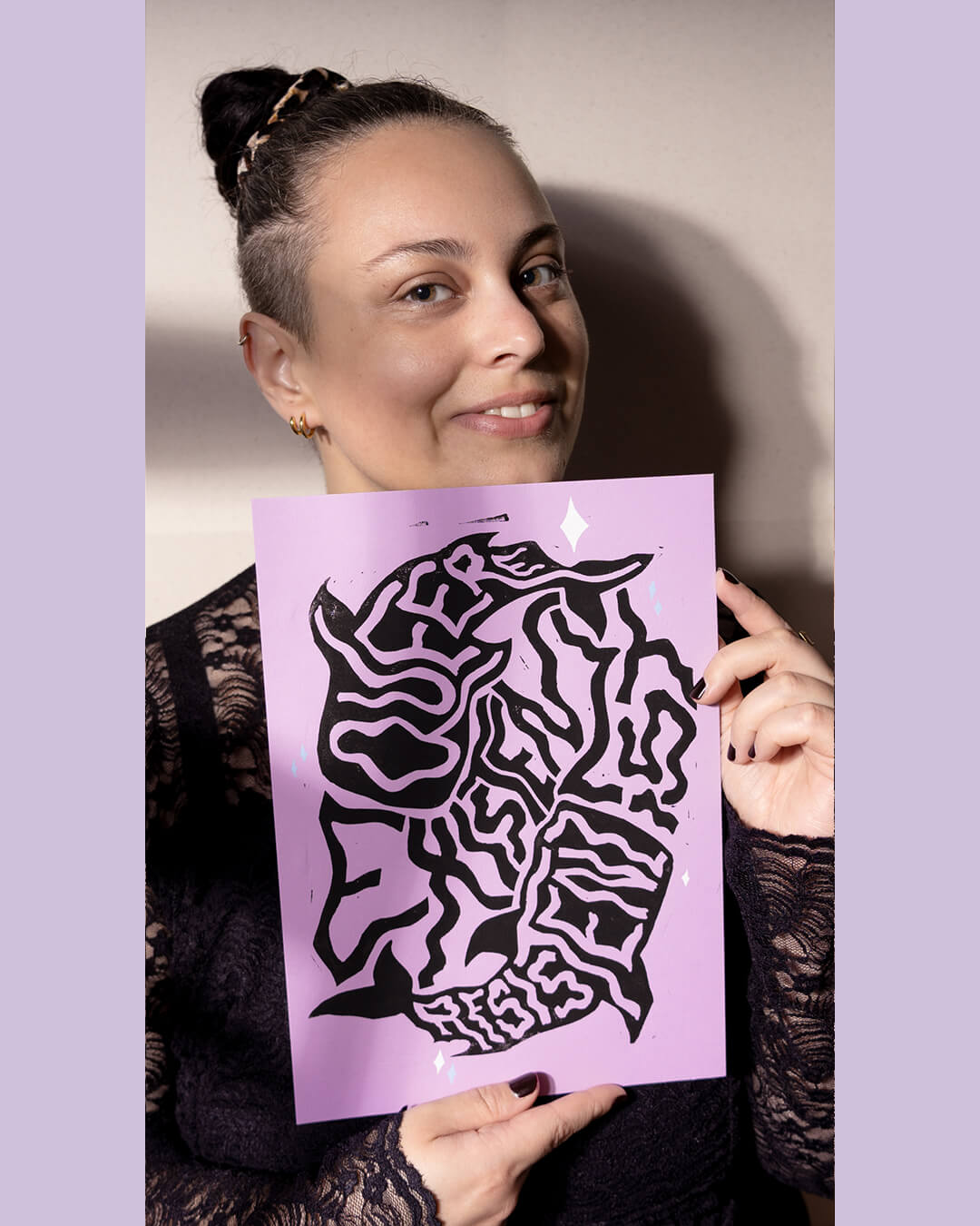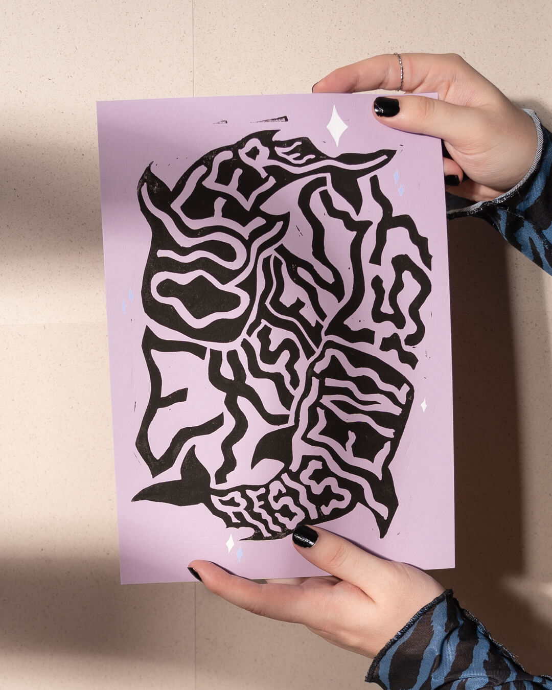 Linoldruck auf DIN A4 Tonkarton. Das Design ist an mein Brand Design angelehnt, die beiden Walhaie stehen für die Resistenz. Haie haben schon vor ca. 440 Millionen Jahren existiert und die Launen der Natur überlebt. Die Sterne sind farblich an der Trans Flagge angelehnt. Die Sterne sind mit Gouache selbst aufgemalt worden. Dadurch ist jeder Linoldruck ein Unikat und kommt mit einem Echtheitszertifikat.